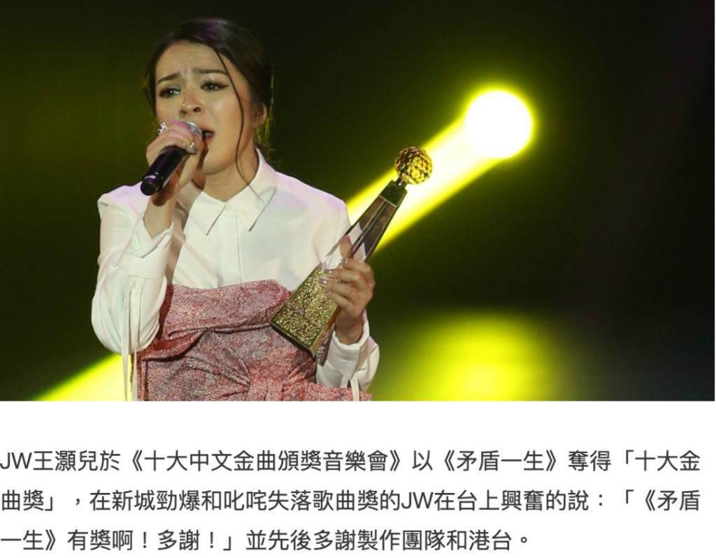 ▲该歌先后于无线电视、香港电台及商业电台的流行音乐榜上夺得冠军,成为JW出道以来的第二首三台冠军歌,也是出道以来的第一首单人三台冠军歌。该歌MV在YouTube上(迄今为止)获得了2100万的浏览量,跻身观看次数最多的粤语音乐之一。