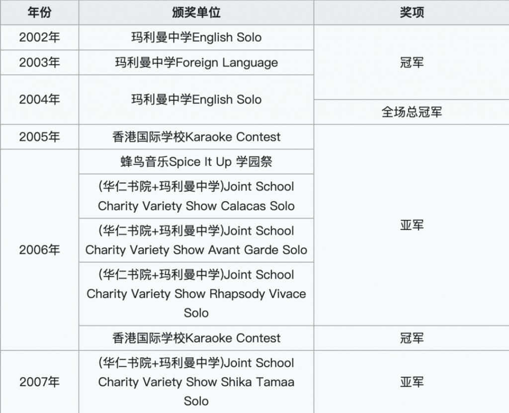 从下面这张统计表可以看出,整个学生时代,JW在各种歌唱比赛中崭露头角。