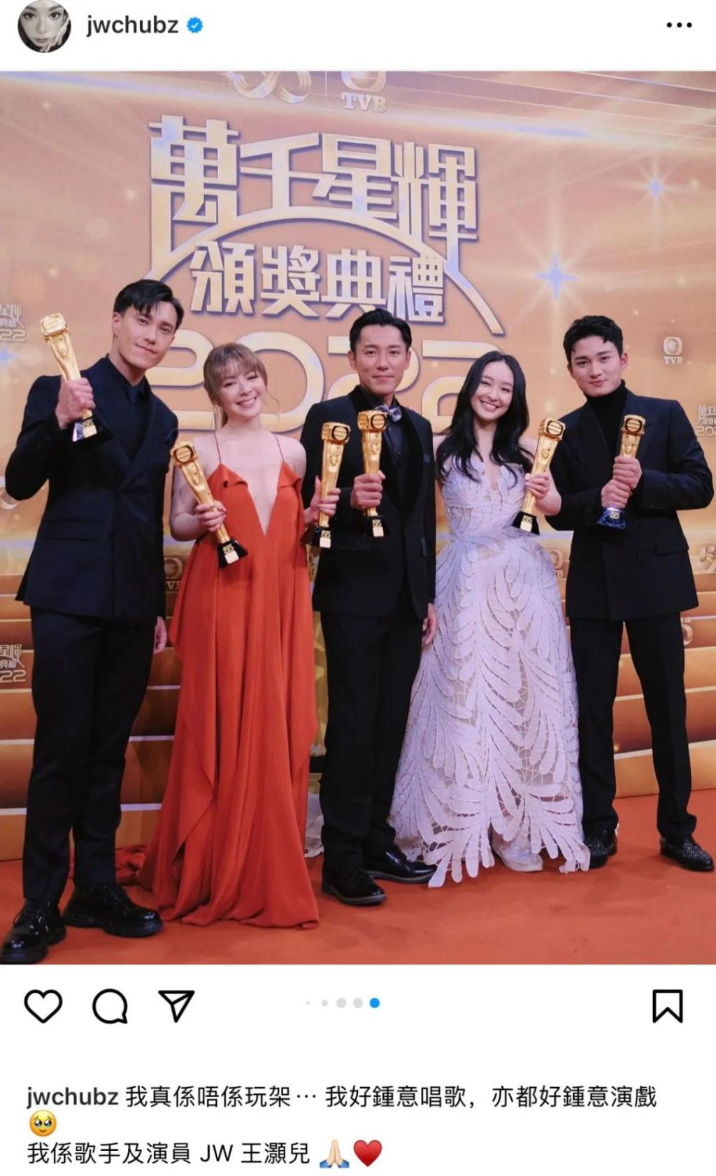 ▲ 2025年,因为《痞子殿下》,她和同剧演员朱敏瀚(左一)、张颕康(居中)、周家洛(最右)、陈滢(右二)拿到了"万千星辉颁奖典礼"的"最受欢迎电视拍档奖"。