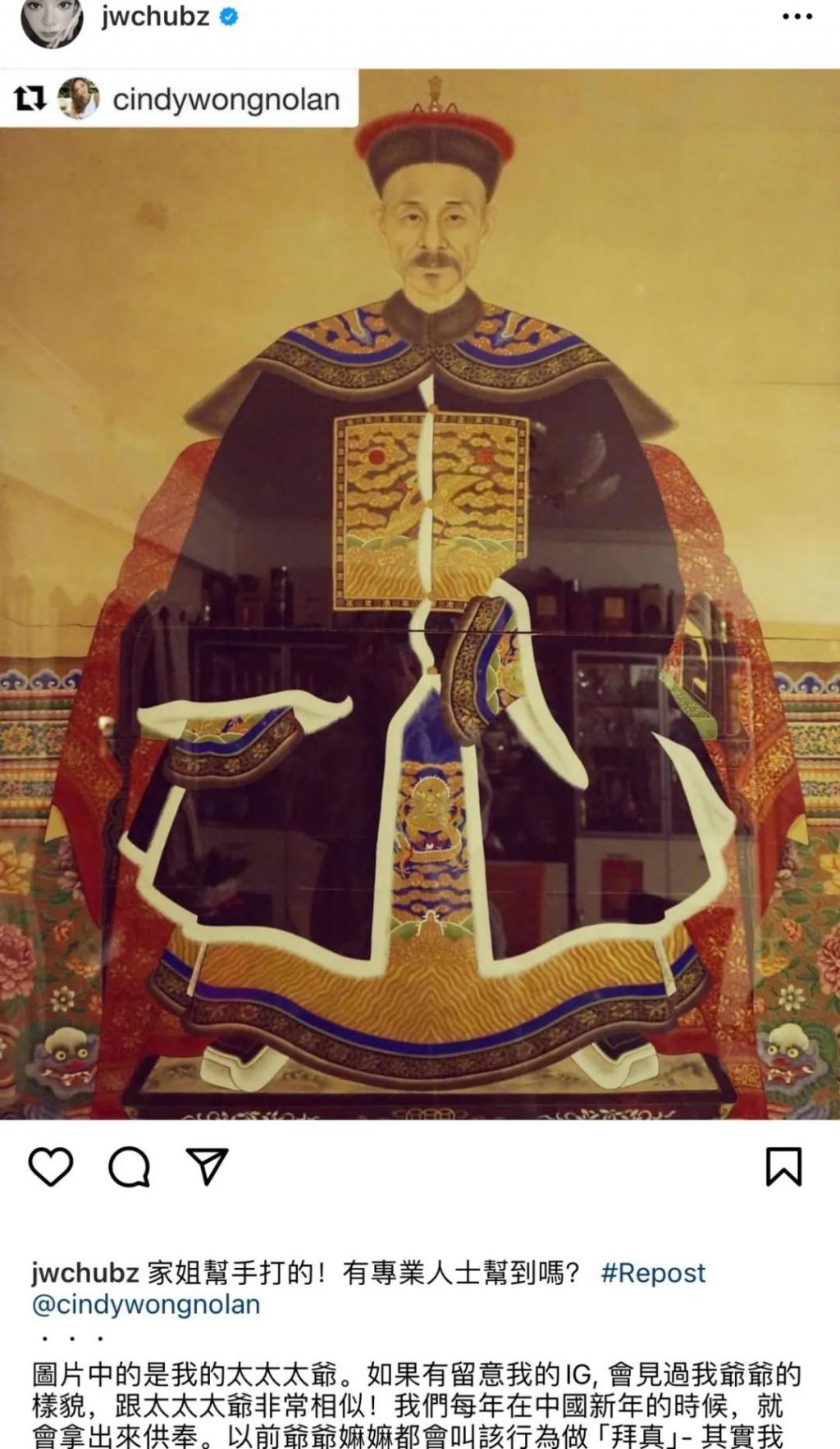 ▲至于父亲这边,JW曾经在活动上透露,自己的太太太爷当过大官,自己应该是正白旗后裔。家里人非常传统,每年春节都会拿出这张旧照供奉先祖。