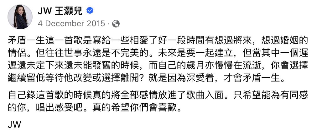 2015年,JW等到了和A Music的合约完结,加盟了新的唱片公司Sunny Idea(意晴),重振旗鼓再出发,并在同年10月发行了新歌《矛盾一生》,大获成功,这也成为了她迄今为止最著名的代表作之一。