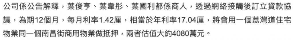 原因是他们在2025年向富英有限公司借了一笔5450万元的贷款,为期1年,平均年利率达17.59厘(即17.59%),相当于每个月的利息为79.57万元,逾期后,累计仍有超过2000万尚未归还。