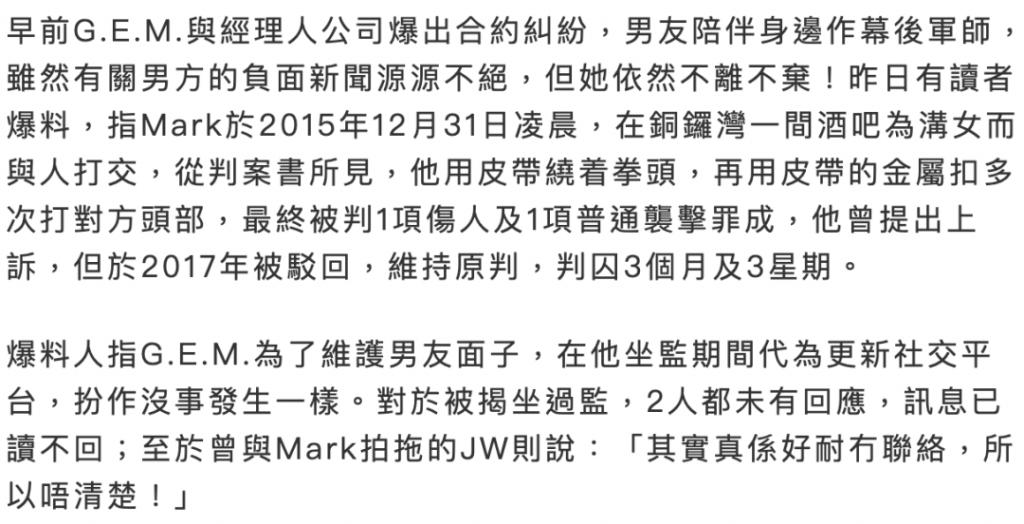 直到很久之后,有新闻爆出,原来在这个平安夜后的跨年夜,2015年12月31日凌晨,阿Mark在铜锣湾酒吧因为"沟女"跟人发生冲突,动手打架,可见当时的他跟JW的感情状况或许已经走到了"分手"阶段。