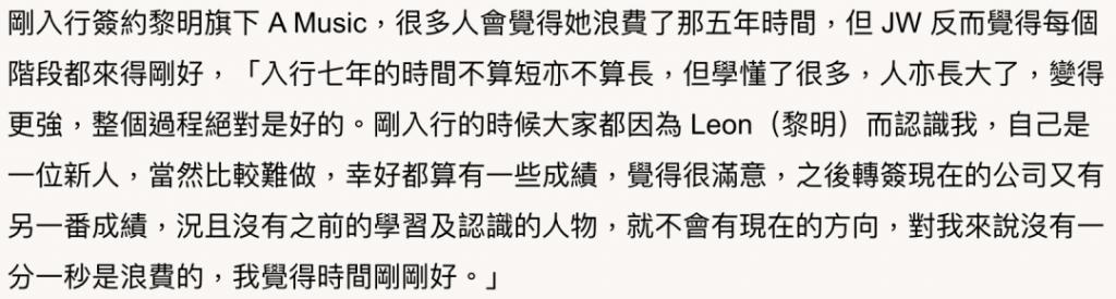 而身为第二名的JW并没有直接签约公司,而是选择专注学业,直到三年后,上了大一的她才加盟由黎明和林建岳合作成立的A Music,开始做兼职歌手。