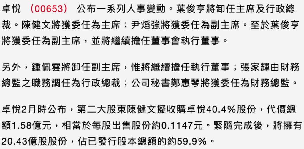 ▲ 陈建文成为主席后,一开始保留了叶俊亨作为副主席、董事会执行董事,钟佩云作为执行董事的职务,直到2025年6月29日,集团发通告宣布创始人夫妇不再在卓悦集团担任任何职务。