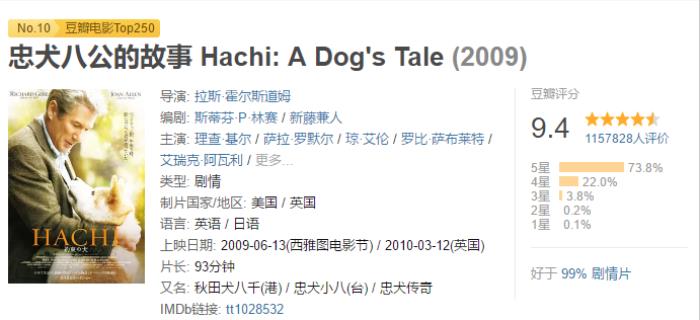 这是我所看过的关于狗狗的电影最感人的一部,还是那 句话:狗的生命很短,人的生命很长,它在你的生命中可能只是一个片段,而你却是它的全部。而八公用它的生命诠释了对主人的爱与等待……
