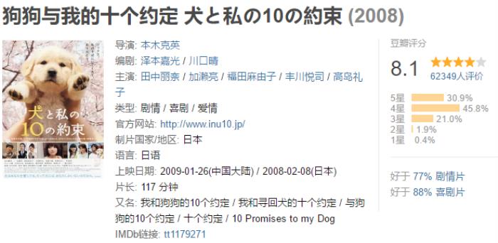 根据川口晴的小说《我和狗狗的10个约定》改编而成的电影,该片由福田麻由子,丰川悦司,高岛礼子主演