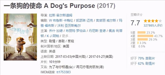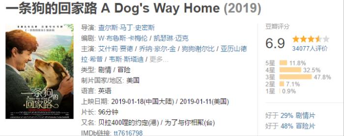 评分不是太高,但挺温情的电影,喜欢就是喜欢,千山万水都阻挡不了它的回家路,还顺带着救了一只大猫。。。