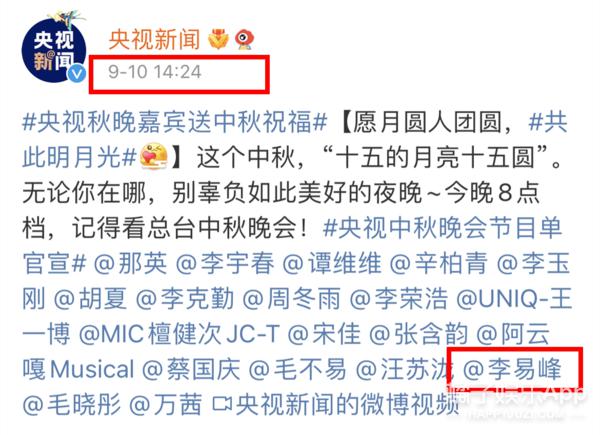 因为下午 1 点 48 分央视发布的中秋晚会节目单中还有李易峰的名字,