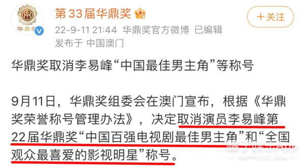 紧接着华鼎奖取消了李易峰第 22 届华鼎奖两项称号▼