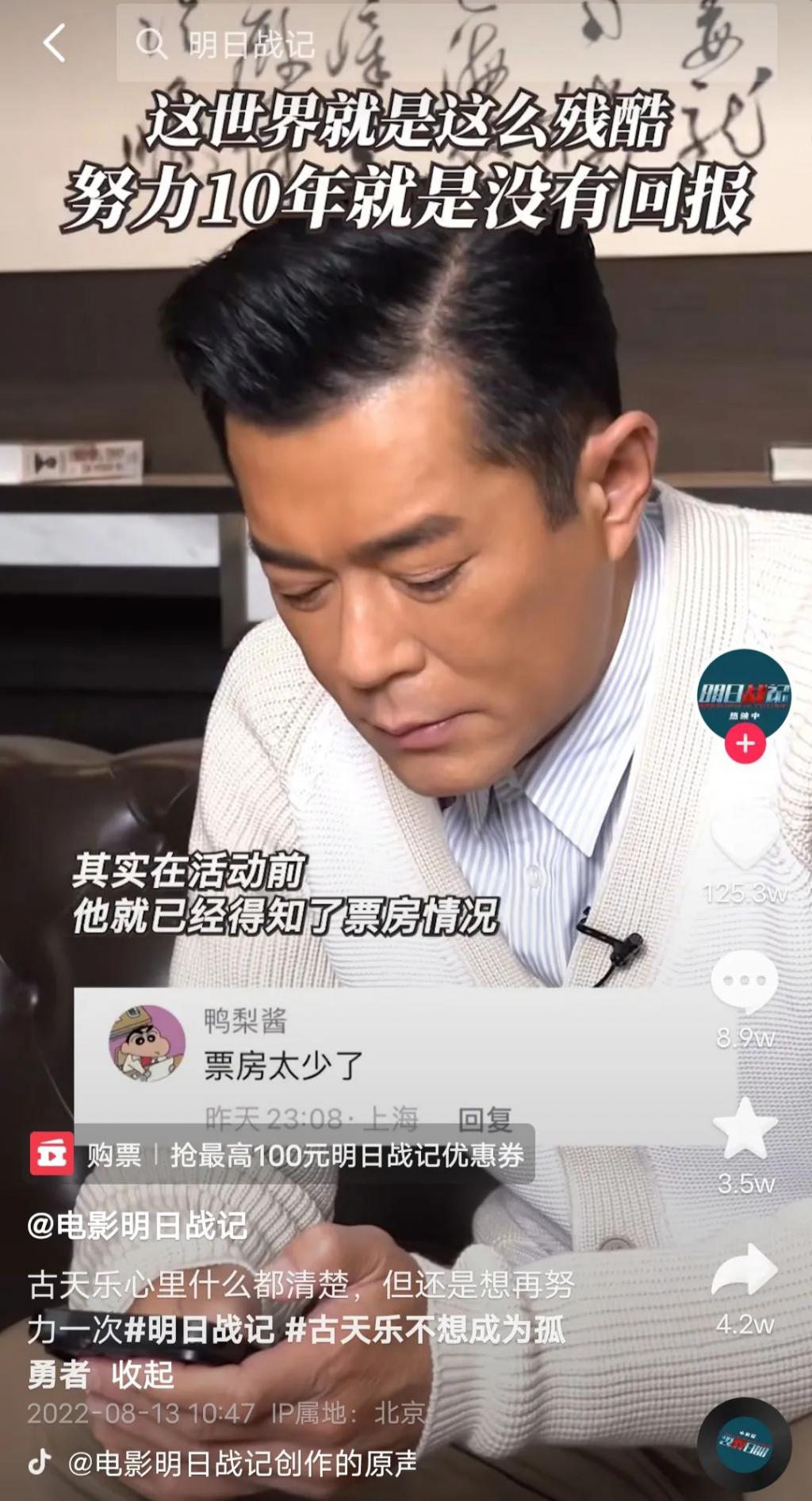 为此,《明日战记》短视频官方账号连发多条视频。大致内容是,这部电影投资近 5 亿,花费了十年时间,票房起码要达到 10 亿才能收回成本,但如今这个目标已是天方夜谭。对此,52 岁古天乐多次在公开场合泪目。