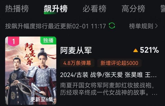 昨晚,一部大女主权谋传奇剧《阿麦从军》在桃厂悄然开播,虽然播得低调,但一晚就冲上飙升榜第一。