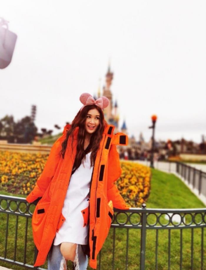 照片中,温碧霞妆容精致,头戴粉色毛绒发箍,身穿抢眼橘红色羽绒服,一头红褐色卷发,看上去十分年轻,丝毫看不出是已过50的年纪。