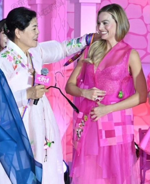珍岛鼓舞蹈演出结束后,韩国服装设计师朴述女又登场了,给玛格特 · 罗比送上了粉色韩服礼物。拍团体照时朴述女还站在了《芭比》剧组中间,甚至还把自己韩服店的名片放在了送给玛格特 · 罗比的韩服里。