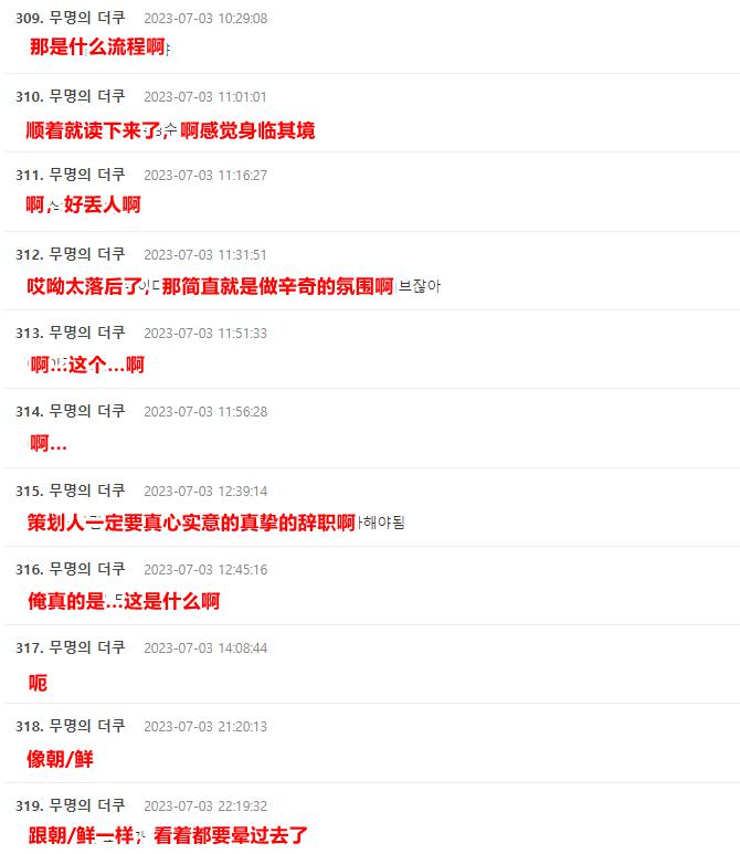 看到以上场面的网友们纷纷吐槽道:" 这是为谁举办的活动啊 "、" 关于电影的话题竟然只讲了 1 分钟 "、" 那些表演和芭比有什么关系吗 "、" 为什么要对其他国家的电影这样啊 "、" 我是韩国人我都觉得丢人了 "、" 是有什么宣传韩国文化的使命感吗?人家是来和亚洲粉丝交流的啊 "、" 朴述女老师很厉害,但是如果不参加这些活动就好了 "……