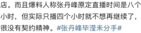 这事怎么抖出来的呢?居然是因为张丹峰不敬业,说好播八小时的,播了四个小时就嫌累不干了,品牌方一怒之下曝光了跟毕滢的聊天截图。