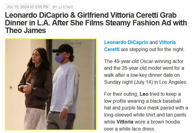 7 月 15 日,据外媒,49 岁的 " 小李子 " 莱昂纳多 · 迪卡普里奥和 26 岁超模女友 Vittoria Ceretti 被拍到在洛杉矶牵手逛街,两人打扮低调。