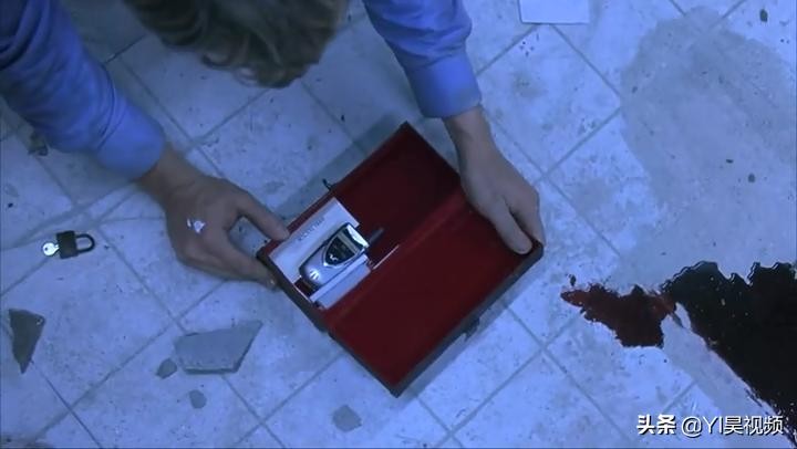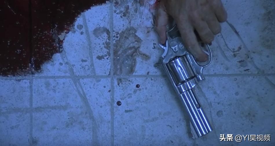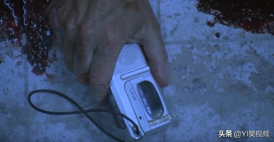 死人鲜血淋漓,头部全是伤口,左手拿录音机右手拿枪。