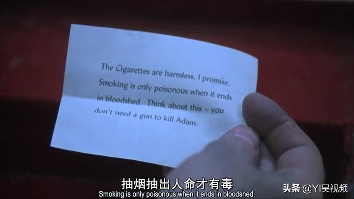 劳伦斯看到照片想起磁带的话,为了救妻女决定让摄像机以为他要杀了亚当,他将香烟沾了毒血,