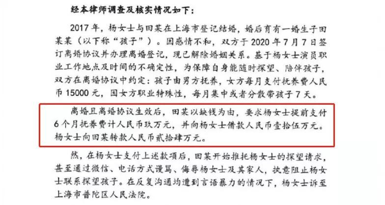 自从离婚协议生效后,田亮向杨明娜借巨款15万,并提前索要6个月的抚养费——9万元。