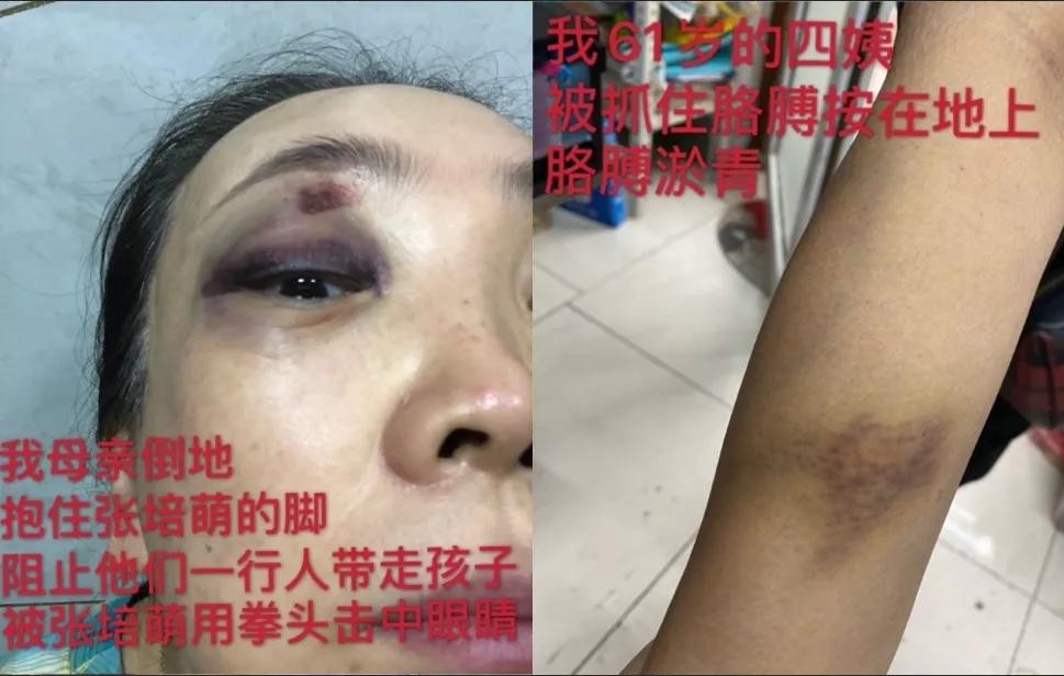 为了阻止他,张漠寒54岁的母亲抱住他的脚,被他一拳打伤眼睛,眼皮处淤青发紫;61岁的四姨阻挠不过,还被他按在强硬地上,胳膊处发青。