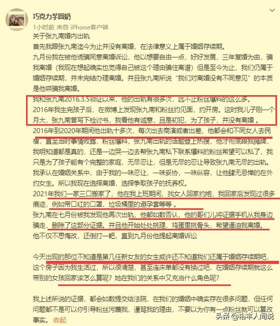 据张九南妻子“巧克力芋圆奶”发文透露,九月份她被对方诱骗同意离婚诉讼,对方给出的理由是想要自由,好好发展,三年以后可以复婚,但是迄今为止,两人的婚姻仍然是存续状态。
