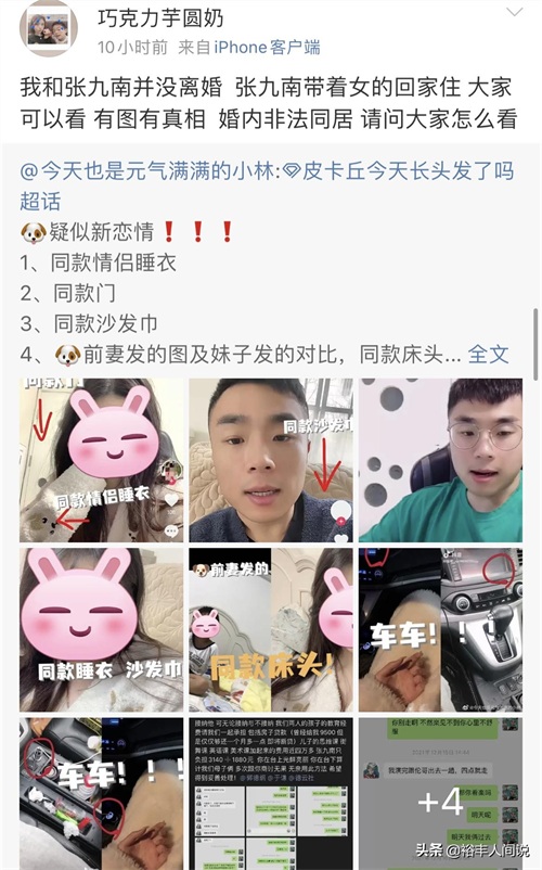 从这则动态中不难看到,张九南与一女子有很多相同的地方,包括情侣睡衣、门、沙发巾等等。除此之外,张九南妻子还曝出家暴以及出轨的时间线。