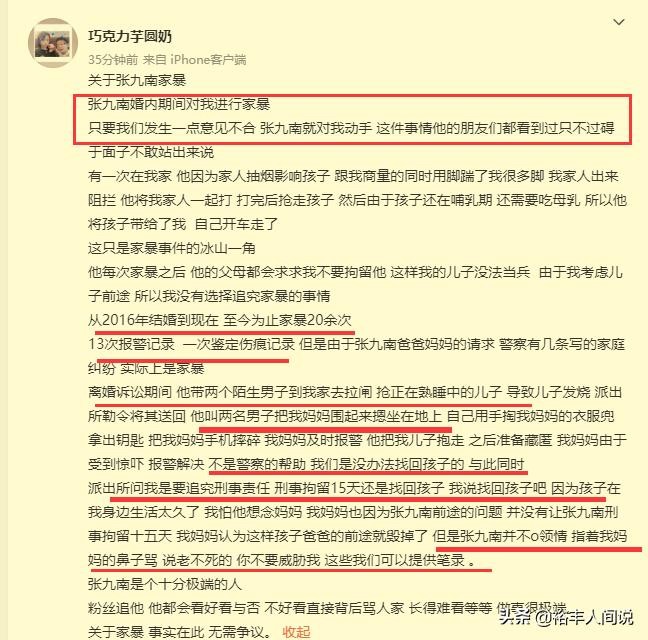 除了曝料婚内出轨之外,张九南妻子还透露长期遭到家暴。只要有一点意见不合,就会对其动手动脚。