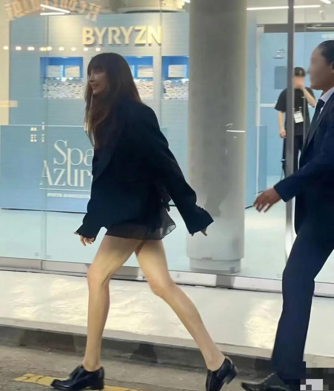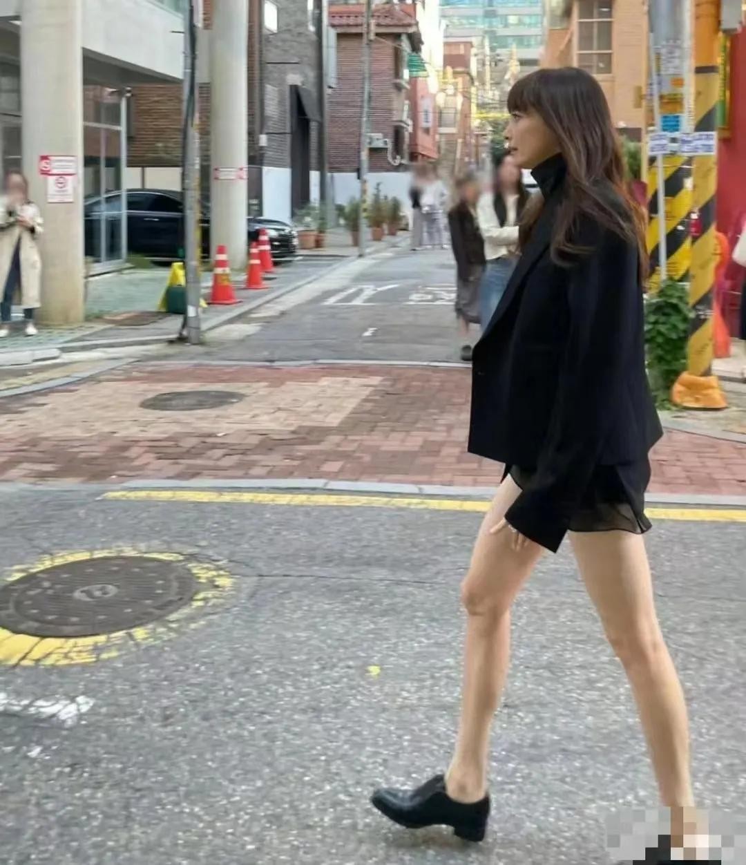 她依然留着刘海发型,看起来比较减龄,穿着黑色西装外套,搭配短裤,上衣下衣失踪,身高169cm的她,身材比较真的很惊人。