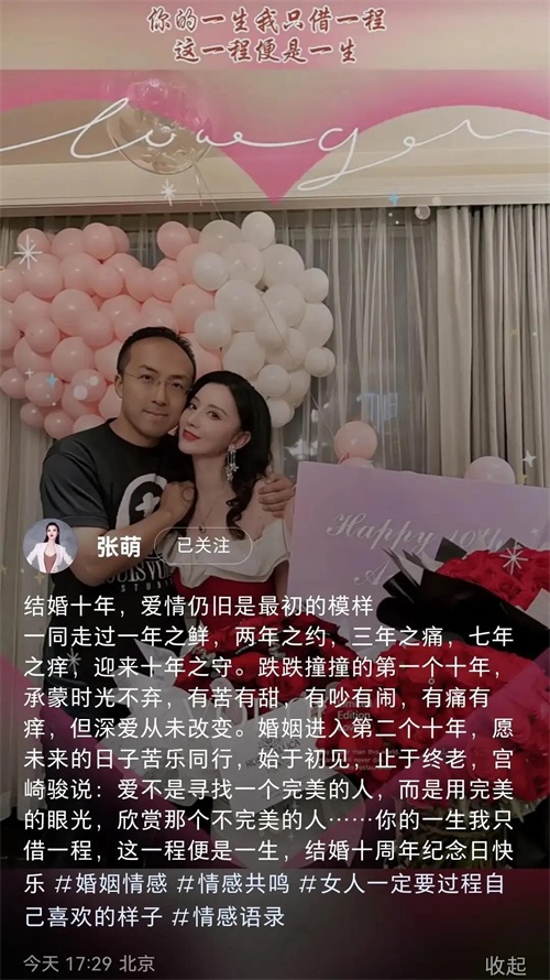 张萌庆祝结婚10周年,与富豪老公秀甜蜜,罕晒合影住豪华酒店