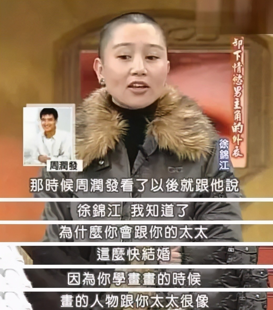 后来,周润发在一本杂志上看到徐锦江画的一幅人物画与妻子的照片,他对徐锦江说:我终于知道你为什么这么快结婚了。原来你就是按着你画中的女子来找的,真是太像了。