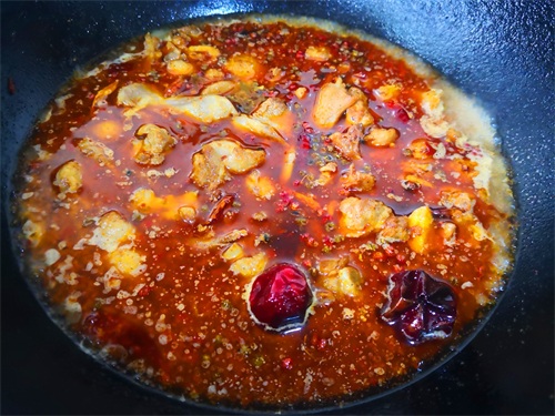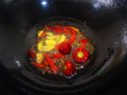 第三步:锅洗净,倒入玉米油烧到三成热,下姜片,蒜片,青红花椒,灯笼椒,小米辣下锅,用小火慢慢炸香。