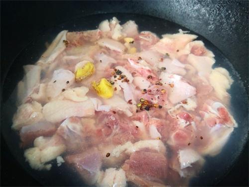 第二步:鸭肉块冷水下锅,加姜片,白酒,花椒大火烧开后撇去浮沫。继续焯水一分钟后捞出,用温水清洗干净控水后待用。
