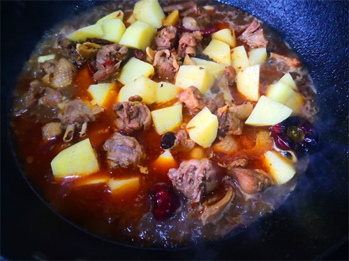 第七步:到时间感觉鸭肉差不多快要酥烂了,放入控干水的土豆块,大火烧开后转小火继续炖8分钟左右到熟。我用的是黄土豆,如果用白土豆的话容易起沙,需要少炖2分钟左右。