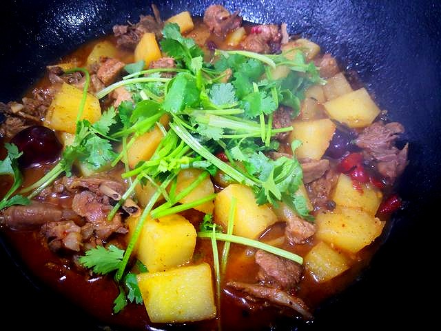 第八步:土豆差不多熟的时候就要大火收浓汤汁了,最后关火将香菜放入炒匀,滴入花椒油,即可出锅装盘,大功告成了。