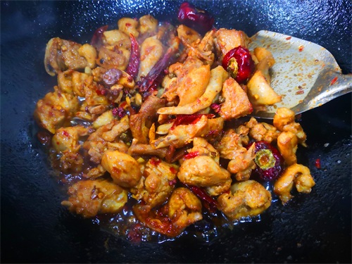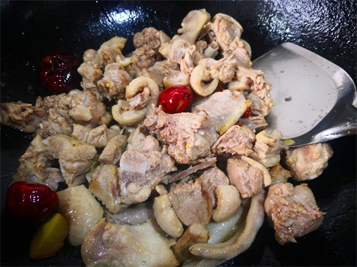 第四步:当锅内花椒香味溢出,即可放入洗净的鸭肉块用中火翻炒。直到将鸭肉炒干,吐油为止。