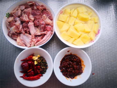 第一步:将半只鸭子剁成块,最好剁小一点容易入味,然后清洗两遍控干水分待用。土豆去皮切滚刀块,浸泡在清水里去掉表层淀粉。辣椒,干花椒用清水浸泡一下,去掉杂味的同时可以防止等会下锅就糊。豆瓣因为是自家做的不需要剁,如果是买的话最好剁细一点。