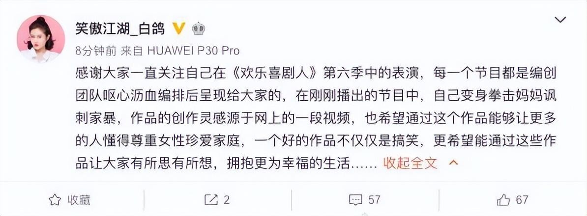 见事情发展超出了预期,白鸽只好出来解释,说小品并非自己的现实,只是想要呈现的现实而已。
