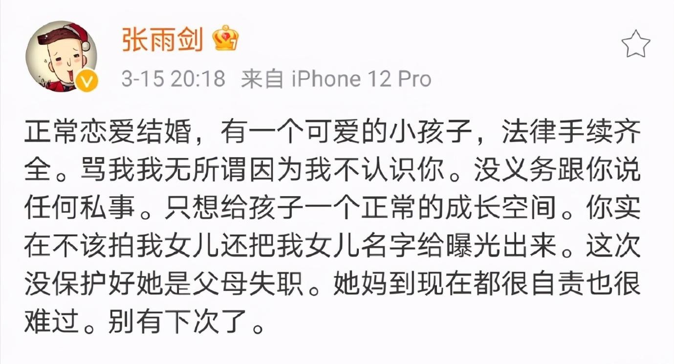 然而,张雨剑的态度却一直含糊不清,始终都不肯公开两人的关系。直到后来频频被媒体拍到,张雨剑才不情愿地承认了这段婚姻。