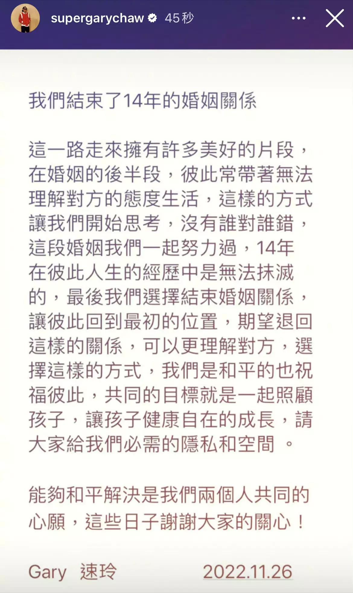 11月26日,两人在社交平台官宣离婚,结束了这段长达14年的婚姻关系,至于两个孩子则是由双方共同抚养。