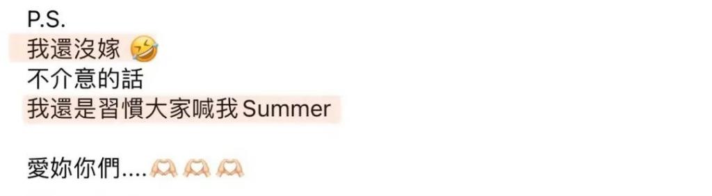 " 我还没嫁,还是习惯大家喊我 Summer。"