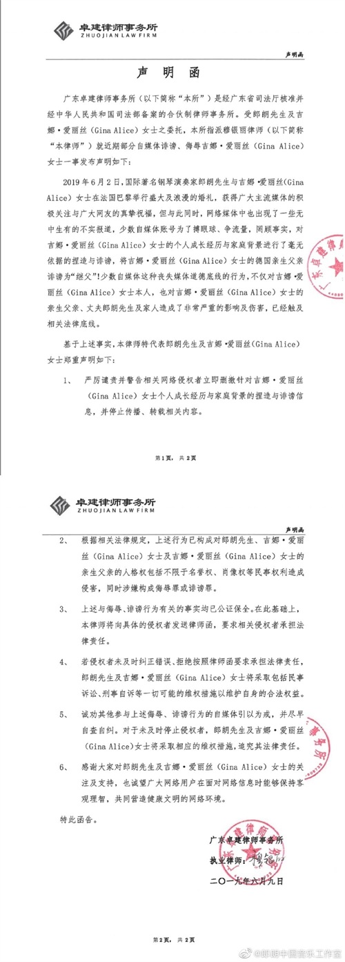 新京报讯(记者 杨畅)6月10日上午,郎朗工作室发声明辟谣近日传闻,称少数自媒体对郎朗妻子吉娜·爱丽丝(Gina Alice)的个人成长经历与家庭背景进行了毫无依据的捏造与诽谤,将吉娜·爱丽丝的德国亲生父亲诽谤为“继父”,郎朗方要求其删除相关内容,并将追究法律责任。
