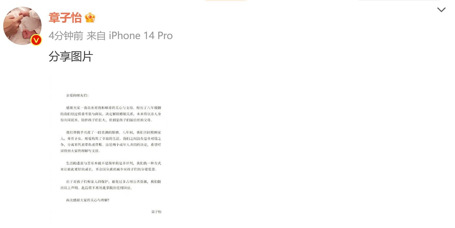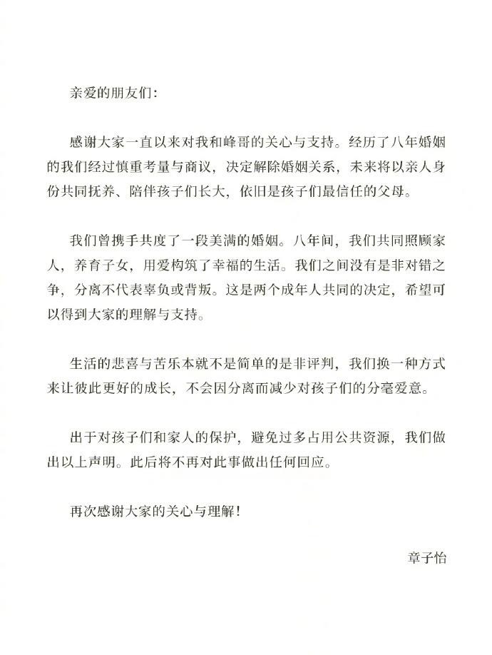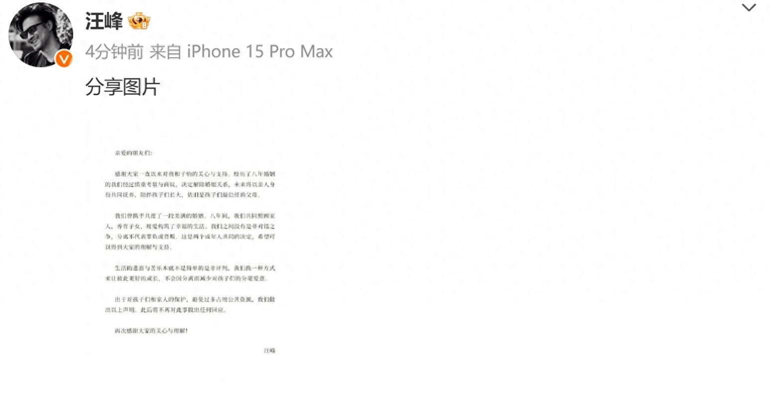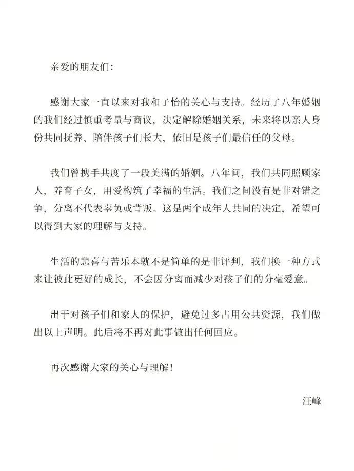 这段婚姻的结束无疑对章子怡和汪峰以及他们的孩子们来说是一次巨大的转变。他们将以亲人的身份共同育儿和陪伴孩子们成长。对于这对明星夫妻来说,他们的离婚决定对他们的事业和个人生活都会有所影响。总结来说,章子怡和汪峰宣布离婚的消息引起了广泛关注。