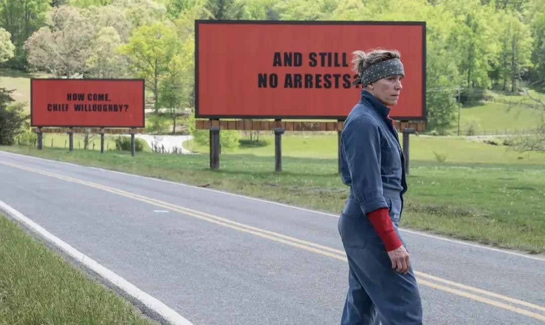 电影以三块广告牌为线索,讲述了一位母亲在女儿被谋杀后,租下高速公路旁的三块广告牌公开控诉警方无能的故事。