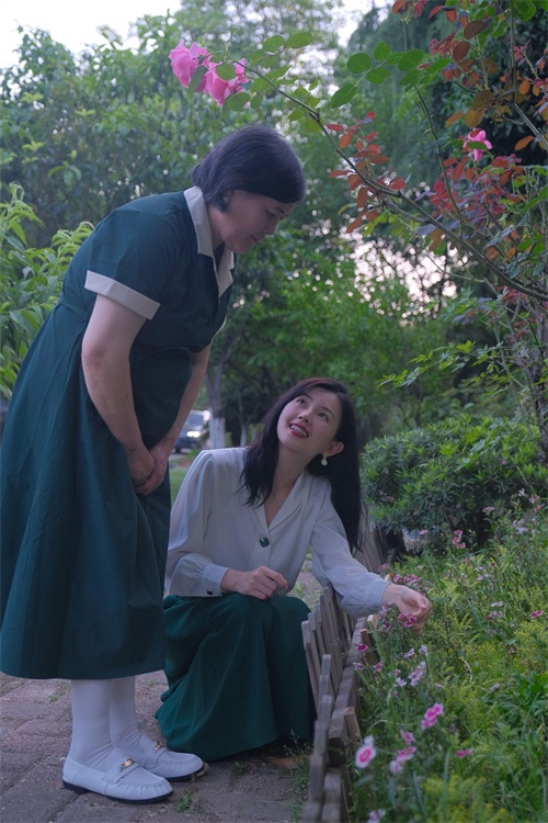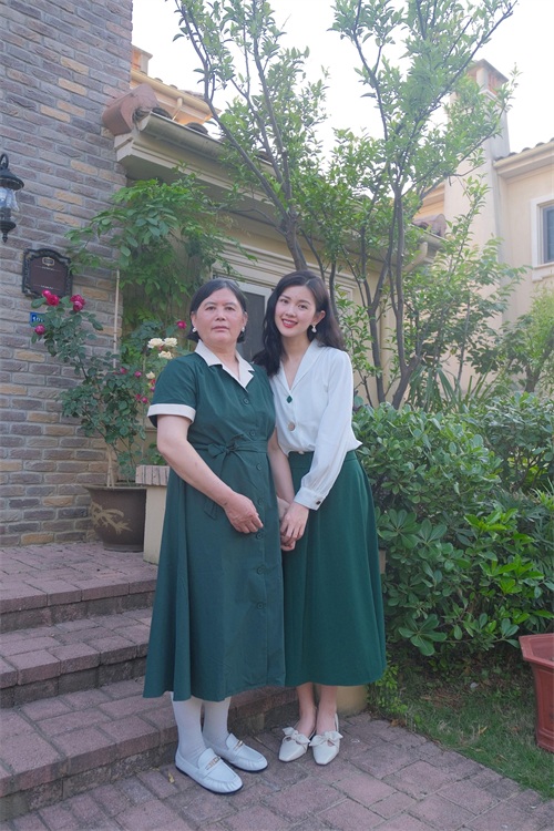 升级为母亲的钟恩淇虽然穿搭上虽依然保持着极简主义,但整个风格偏向于轻熟优雅风。身穿绸缎衬衫搭配绿色半裙的她知性优雅,白绿两色有着强烈的反差但不会过于浮夸,举手投足之间尽显低调大气。微卷的披肩长发则增加了成熟气质,与这套搭配相得益彰。