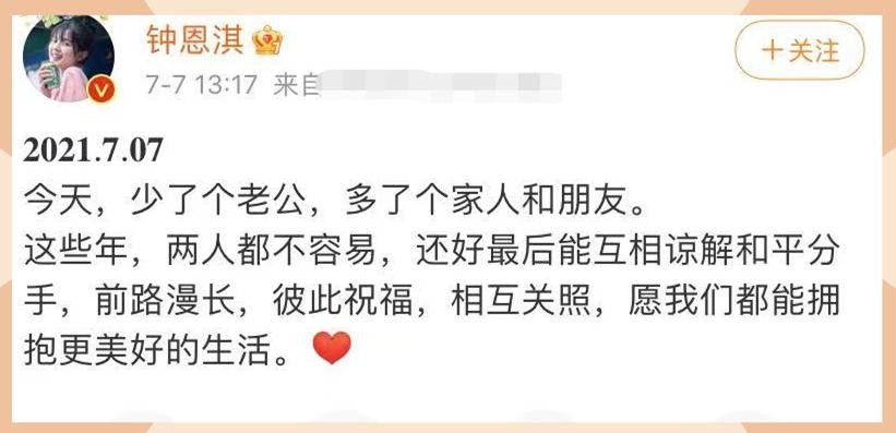 不过不合适的婚姻早点分开也算是幸事一件,既然选择了体面分开,那就祝愿两人各自安好吧!#钟恩淇#