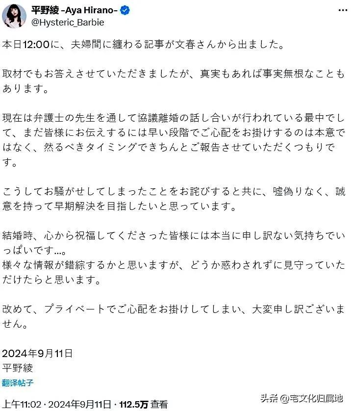 文春发稿后,平野绫也第一时间在社交媒体上发文承认【婚变属实】,目前与谷口正在协议离婚中。不过她表示文春的报道也不全是事实,有部分内容为虚构且毫无根据。