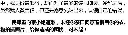 第二:我和赵先生就是普通朋友,衣服是和赵先生借的,之前你秦小姐什么都知道,以前风平浪静的时候你和我和平共处,现在被曝出轨了,就用我来转移视线,我不替你背黑锅。