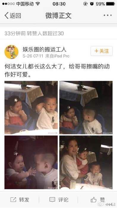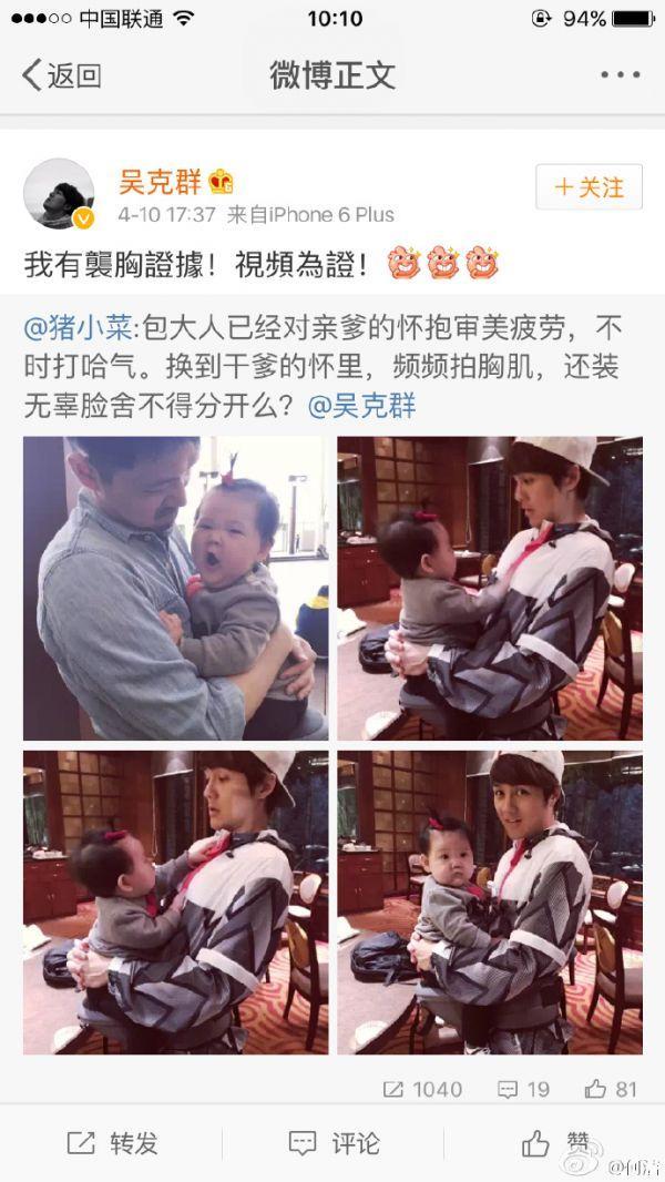 原来,爆料所指的宝宝叫包包,是吴克群的干女儿。吴克群也在微博与何洁互动,疑似辟谣。