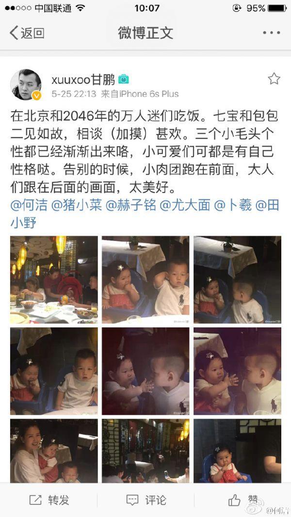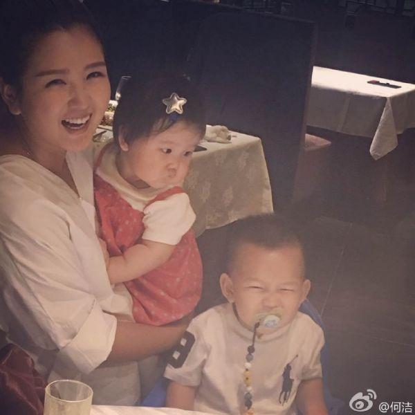 5月25日晚,某认证资料为媒体人的网友在微博晒出与何洁一家聚餐的照片。照片中,何洁与坐在右手边的大儿子七宝亲密互动,老公赫子铭则在画面右侧,手拿玩具哄着婴儿车里一个系着粉色发带的女宝宝,引人猜测画面中的女孩就是何洁二胎女儿宝妹。